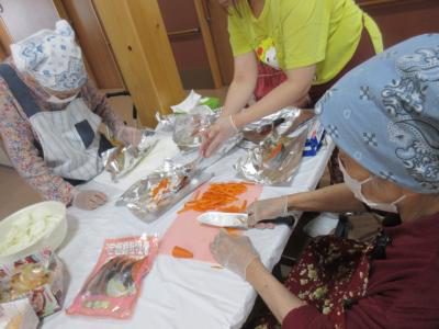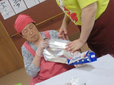 スタッフと一緒にアルミホイルの準備をして下さる母