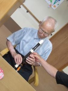 見事、大きなアルトリコーダーを吹く父