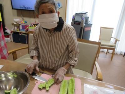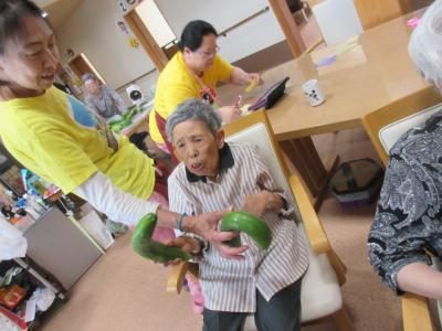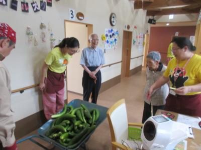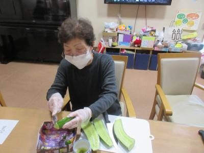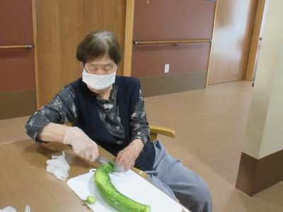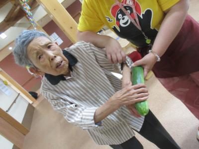 母が洗ってくれた胡瓜を皆で切る