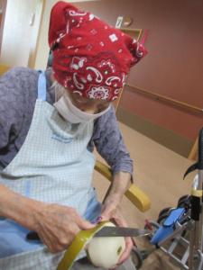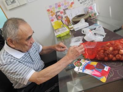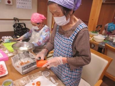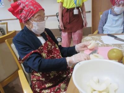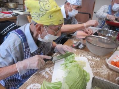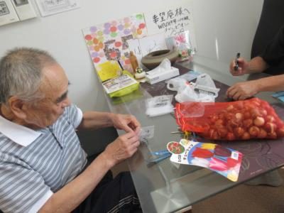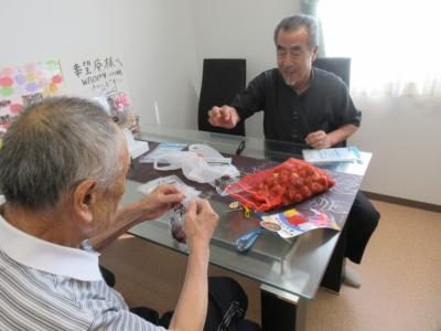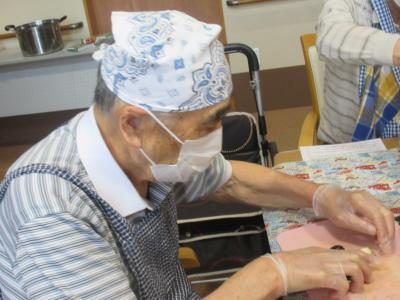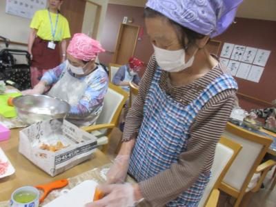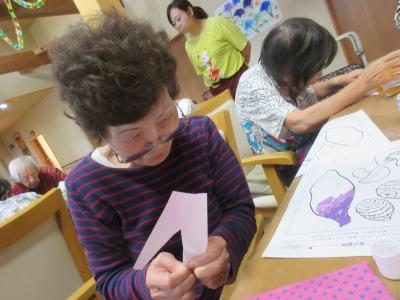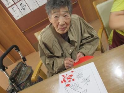 秋の味覚のサツマイモのちぎり絵に挑戦中のお二人