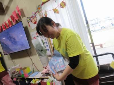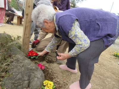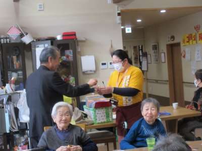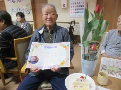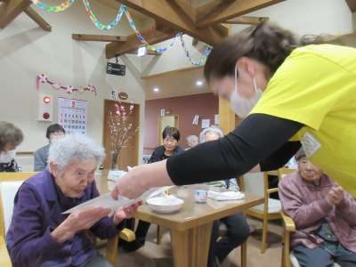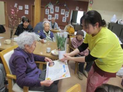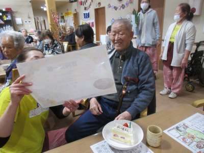 バースデイソングをみんなで歌いバースデーメッセージとお花のプレゼントをプレゼント