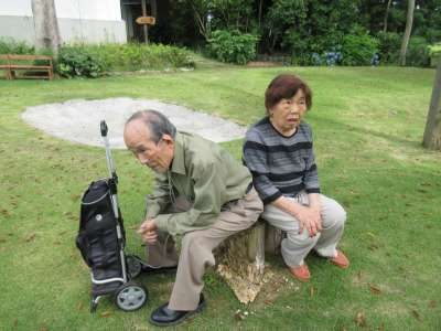 お母さんちょっと休憩しよう!2人仲良く切り株に