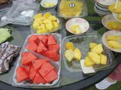 冷え冷えのスイカとパインを取り分けて