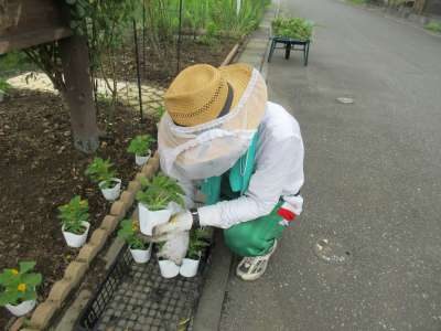 バーベキューの準備につづき、花壇の手入れや庭の