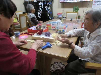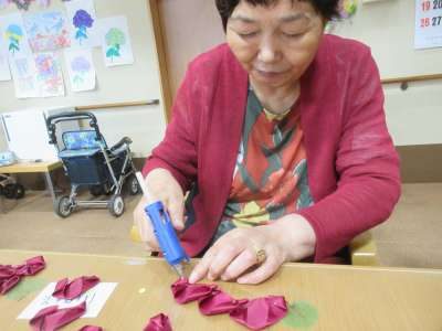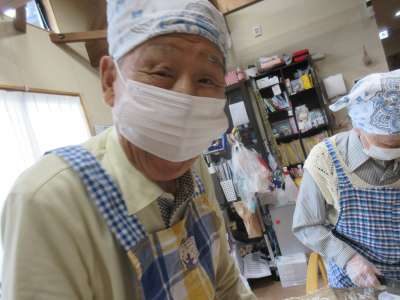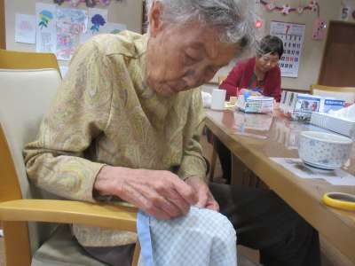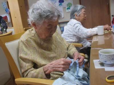 お裁縫が得意な母はみんなが着るエプロンのボタンつけを