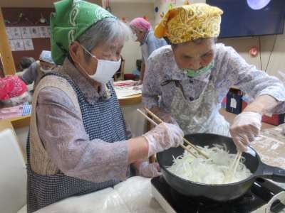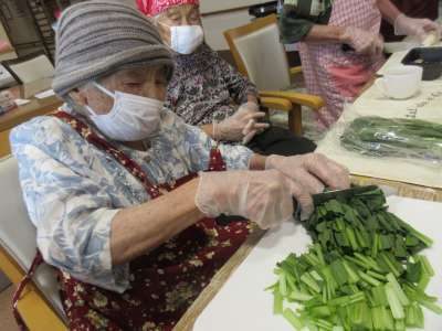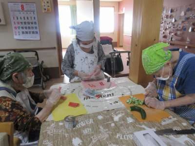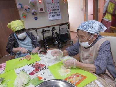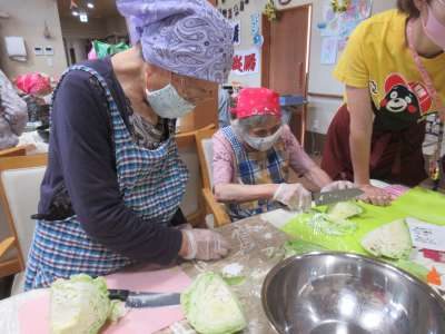 肩ひもが落ちても気にしない集中力でレタスを切ってくださる父