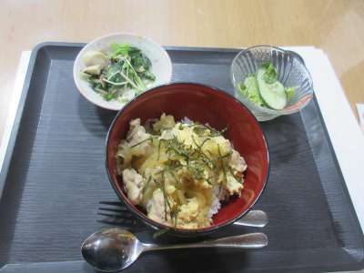 親子丼・キノコと小松菜ソテー・フレッシュ野菜サラダ