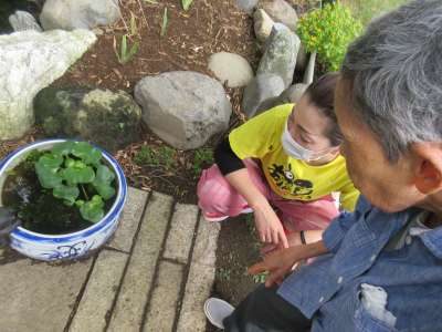 『メダカが沢山いる~』嬉しそうに覗き込む母と娘グッド (上向き矢印)