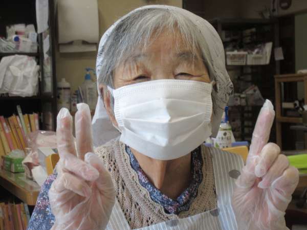 エプロン・マスク・三角巾に手指消毒