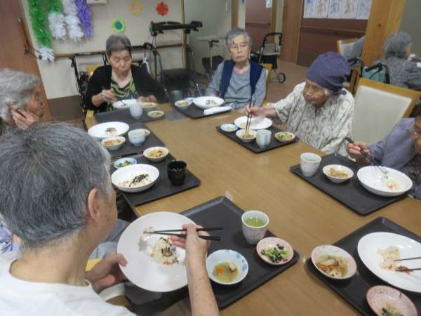 本日の昼食は、ちらし寿司・煮物・きのこたっぷりの炒め物